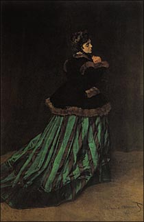 モネはこんな人です。初期1840年パリのラフィット街に生まれる。5歳の時、一家でノルマンディー地方のセーヌ河口の街ル・アーヴルに移住した。モネは少年の頃から絵画に巧みで、十代後半の頃には自分の描いた人物のカリカチュア(戯画)などを地元の文具店の店先に置いてもらっていた。1856年 - 1858年の年記のある素描や戯画が現存している。1857年にはコレージュを退学。この頃から地元の美術教師でダヴィッドの弟子であったフランソワ=シャルル・オシャールに絵を学んでいる。1858年頃、モネの描いていた戯画が、ル・アーヴルで活動していた風景画家ウジェーヌ・ブーダンの目にとまり、彼らは知り合うことになる。ブーダンはキャンバスを戸外に持ち出し、陽光の下で海や空の風景を描いていた画家であった。ブーダンと出会ったことが、後の「光の画家」モネの生涯の方向を決定づけたと言われている。モネの現存する最初の油絵は、1858年の年記のある『ルエルの眺め』(埼玉・丸沼芸術の森所蔵、埼玉県立近代美術館寄託)である。この作品はバルビゾン派の影響のみられるもので、地元ル・アーヴルの展覧会に出品された。モネは1859年、パリに出て、1860年にアカデミー・シュイスに入学、ここで後に印象派の仲間となるピサロらと知り合う。1年強のアルジェリアでの兵役を経て、1862年秋、シャルル・グレールのアトリエに入り、ここではシスレー、バジール、ルノワールらと知り合っている。グレール自身はアカデミックな作風の画家であったが、彼は生徒に自分の作風を強要せず、自由に個性を伸ばす指導方針であったので、アカデミックな美術教育にあきたらない画家の卵たちが彼のアトリエに集まることになった。1865年、サロンに2点の作品を初出品し、2点とも入選した[1]。翌1866年のサロンには、マネの著名な作品『草上の昼食』(1863年)と同じテーマの作品を出品することを予定していた。この『草上の昼食』は縦4メートル、横6メートルを超える大作であったが、サロン出品の締切までに制作が追いつかなかった[2]。しかし、代わりに1866年のサロンに出品した『緑衣の女』と『シャイイの道』は、2点とも入選を果たした。『緑衣の女』は、モネの恋人カミーユ・ドンシューをモデルにしたもので、ベラスケス風の人物画であり、当時の審査員の好みに合うものであった。1868年のサロンでは出品した2点のうち1点が入選するも、1869年と1870年のサロンには落選し、以後しばらくサロンへの出品を取りやめる。1867年8月にはカミーユ・ドンシューとの間に長男ジャンが生まれるが、家族はモネとカミーユの仲を認めず、彼らが正式に結婚したのは1870年のことであった。1870年7月、普仏戦争が勃発すると、モネは兵役を避けるため、同年9月頃ロンドンへ赴き、翌年5月まで滞在した。ロンドンではイギリス風景画の第一人者ターナーやコンスタブルの作品を研究するが、ロンドンで制作した作品は少なく、カタログ・レゾネによれば6点のみである。当時ロンドンに滞在していた著名な画商・デュラン=リュエルともこの時期に知り合っている。モネは1871年5月までロンドンに滞在した後、数か月のオランダ滞在を経て、同年秋にパリに戻り、同年12月、郊外のアルジャントゥイユに転居した。1870 - 80年代 印象派展アルジャントゥイユでは1871年12月から1878年初めまで、6年強を過ごし、この間に約170点の作品を残している。アルジャントゥイユはパリ郊外のセーヌ川に面した土地で、パリへの鉄道が通じ、交通は便利であった。モネは、1863年に完成したアルジャントゥイユの鉄道橋を、しばしば作品のモチーフにしている。1873年12月には、仲間の画家ピサロ、シスレー、ルノワールらと「芸術家、画家、彫刻家、版画家その他による匿名協会」を結成。1874年4月 - 5月にはパリ、キャピュシーヌ大通りの写真家ナダールのアトリエでこの「匿名協会」の第1回展が開催された。後に「第1回印象派展」と呼ばれる、歴史的展覧会である。この第1回展にモネは油絵5点、パステル7点を出品。出品作のうち、『印象、日の出』(1873年)[3]は、「印象派」という名称の由来となったことでよく知られている。なお、一般にはパリのマルモッタン美術館所蔵の絵が、この時の出品作だとされているが、マルモッタンの絵は実は「日没」を描いたもので、第1回印象派展に出品された『印象、日の出』とは別の作品だとする見方もある。また『キャピュシーヌ大通り』(1873年)もこの第1回展に出品したものである[4]。モネは1876年春の第2回印象派展には18点、1877年春の第3回展には30点、1879年春の第4回展には29点の作品をそれぞれ出品している。第2回展には日本の衣装を着けた妻カミーユをモデルにした『ラ・ジャポネーズ』を出品しているが、これは、風景画家モネによる人物画の大作として注目される。なお、カミーユは1879年、32歳の若さで死去している。1877年初頭には、パリのサン=ラザール駅を題材にした12点の連作を制作し、そのうちの8点が