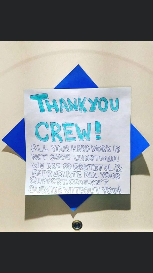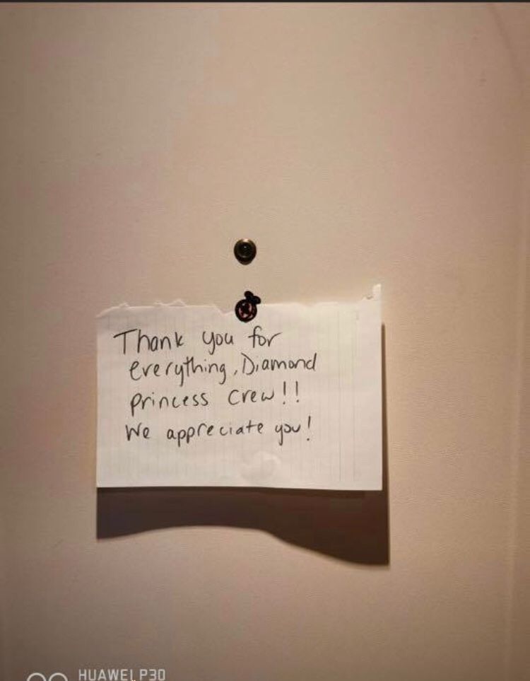 乗務員より投稿された写真です。クルーに対する感謝の気持ちを客室前のドアに書いてくれています。不満を伝える乗客ももちろんいますが、多くのお客様もこのように乗務員を 労ってくれています。 2015年から2018年の12月まで約3年程クルーとしてダイアモンドプリンセスに乗船していました。 多くの知人が乗務員としてまだ乗船しています。 今回ダイアモンドプリンセスでコロナウィルスが発生したと言う一報を聞いた時は残念な気持ちと共に、ああやっぱり起きてしまったんだ。と言うのが正直な気持ちでした。 ただ、元クルーとして言わせて頂きたいのは、今回の件は決して乗務員の対応が悪かったのでは無く、このコロナウィルスが感染力が非常に高い事から運悪く発生してしまったためだからと言うことです。 私達、乗務員は様々な業務があります。主にホテル部門の接客、船を運行する技術部門、そして医療部門です。 この部門に関係なく、全員が必ず受けるトレーニングに環境保全、そして避難訓練と安全の訓練があり、乗船直後、特に初めて乗船する乗務員は徹底した指導があります。 トレーニングにはウィルスの感染予防、万が一感染した場合の対策などが含まれます。 特に気をつけていたのがノロウィルスとインフルエンザ。もし感染した場合は乗客でも乗員でもドクターの許可がでるまで室内に隔離になります。 細かいマニュアルもあり、感染者の人数によって警戒レベルも別れています。このレベルによって消毒液の強度を変え、また殺菌スプレーを使う頻度が変わります。 乗務員のインフルエンザ予防接種も徹底しています。 これだけウィルスが蔓延するのを想定しているんです。なので今回のコロナウィルスもあり得るだろうなと予想していました。ダイアモンドプリンセスで感染が確認される前に他船でも感染報告もありましたね。 ダイアモンドプリンセスの構造は18階建。4階より下は水面下、主に倉庫や乗務員のキャビンがあります。 外のデッキやバルコニーに出られるのは甲板を除くと7階より上の階からになり、どうしても密閉された空間が多いのです。 なのでウィルスには非常に気を付けているんです。 具体的には手洗いの徹底、トイレのドアはペーパータオルで開閉して直接触れない、握手などの接触はなるべく避ける、やむを得ないくしゃみは肩で口を覆うようにするなどです。これはお客様にも避難訓練中に必ずアナウンスされています。 ただ実施していだくのはお客様次第になってしまい、本当に指導通りに徹底される方はあまりいないのだと思います。だからこそ、乗客の方から感染者が広がったのではないかと予想しています。 また、時期的に旧節の正月に近いクルーズなので、船内の乗客が中国系のお客様が多かったのも原因だと思います。 乗客の半数は日本人、後はアメリカ、カナダ、イギリス、オーストラリアと東南アジア辺りと推測されますが、こういう時期は例えばアメリカ人でも中国系アメリカ人が増えるんです。言葉の関係もあるのでどうしても同じ言葉を話すお客様同士で仲良くなる傾向にあります。これも感染者が増えた一因だと考えています。 では何故香港で下船した乗客が感染確認されたのに、通常通り船内活動を続けていたのか?皆さん疑問に思われていると思います。 この件は次回の記事で詳しくお伝えさせて頂きます。