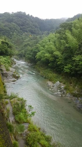 梅雨まっただ中の高知県大豊町 雨にも負けず約20名の人たちがタジカワ川のすぐそばにある「イチノセシモの森」に集まりました。 夏には水遊びができるタジカワ川。水がきれいです。 土佐植物研究会会長、鴻上泰先生を講師としてお迎えし、立川体験交流会主催の「森の不思議、木の不思議」イベント開催です。 参加者の自己紹介、日程説明、樹木の名札の準備をし、さあ、イチノセシモの森に出発です 森に入るとさっそくナナフシが歓迎してくれました。 森の緑にみごとに溶け込んでいて、 鴻上先生が見つけてくださらなければ、きっと見過ごしていましたね。 先生の説明を聞きながら、それぞれに持っている木の名札の木を見つけるとその木の幹に名札を取り付けていきます。 この木は…… カクレミノの木。木の肌を見ただけで、何の木かわかる先生はすごい カクレミノの葉っぱ。3つに分かれたこの葉は成長するとなんと!1枚にかわるそうです。不思議…… 何気なく見ていたシダも何百種類もあるのだそうです。先生の説明を聞いて、改めてそのあたりのシダを見ると確かに違いがある 。観察は大事です。 そんなこんなで先生から草木の説明を聞きながら、森の散策も終わりに近づいた頃、12時のサイレンがなりました。お昼ご飯です 立川体験交流会の方が昼食を用意してくださったいました。 銀不老ご飯、そうめん、野菜の煮物に酢の物デザートは大豊町特産の碁石茶ゼリー。どれも、本当に美味しく、あたたかいおもてなしの心に感動しました。 午後から、鴻上先生の樹木や森のお話を聞き、森の緑に恵まれているのは、とても幸せなことなのだと感じました 。(虫や蛇も生息しているので、ちょっと苦手な時もある) そのあと、探索中に集めた葉っぱでしおり作りをしました。 いろいろな形の葉っぱを組み合わせて和紙の上に並べて、パウチング。 本当に多種多様。樹木や草花、一体どのくらいの種類があるのでしょう名前を言えるものなどほんの僅かです。というより、ほとんど知らない ……ことがよくわかりました。 幸福度アップ の一日 立川体験交流会の皆さん本当にありがとうございました。