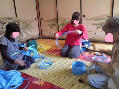 昨日までの温かさはどこにやら。今日は霜注意報の出ていた大豊町です。寒い一度温かくなっているので寒さがこたえます。 さて、農作業には欠かせない腰につけるカゴ。買うと結構高いのですが、自分で編むこともできると聞いたので講習会に参加。 昔は竹で編んでいたのですが、今は荷造りに使うバンドを用いています。 一定の長さにバンドを切りそろえたら、作業開始です。 最初に底の部分から編み始めます。 長いバンドが絡まって、あたふた この方は上手に編んでいますよ私のは網目が粗いので隙間が空いています。締めているつもりですが、すぐに緩んでしまうのです。ん~、なかなか難しい。 それでも何とかがんばって・・・編み進むと、二色使いの物は模様がはっきりしてきました。単色もなかなかいいですね。ここで半分ぐらい、折り返し地点です。 一重めが編みあがり、この後網目に沿ってバンドを差し込んでいきます。 お弁当を持っての講習会参加、今日はここまで。後はお持ち帰りして家で完成させます。一日で何とか一個出来上がり 編み始めたら夢中になりますよ。 今年は新しいカゴで、お茶摘みですワラビ、ぜんまい、たけのこなどなどの収穫にこのカゴは大活躍 明日はワラビ採りの予定です。温かいといいのですが・・・。