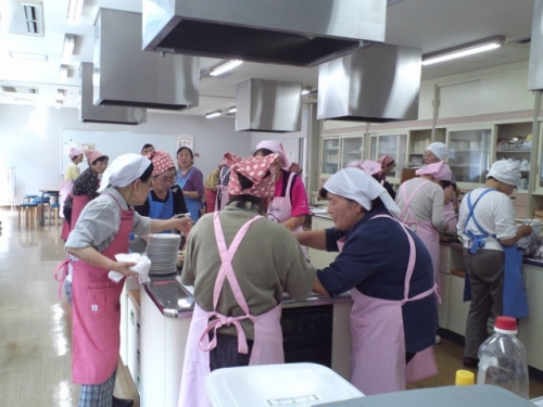 久しぶりのブログアップです。夏日を記録している今日この頃。ここ大豊町では暑さも吹き飛ぶさわやかな手作り弁当が90歳以上の大豊在住者の方々に届けられました。おかずのメニューだし巻き卵、豚肉の味噌炒め、野菜の煮物、野菜のかき揚げ、ほうれん草の胡麻和え、キャベツの酢の物、ゆず寒天今日は朝7時からヘルスメイトのみなさんが集まってお弁当作りです。ピンクのエプロンもさっそうと調理開始前日に下準備をしてくださった方々のおかげで、調理がスムーズに運びます。手際がいいですね。野菜のかき揚げ、どんどん揚がってゆきます。全調理の写真を載せられないのが残念! 盛り付けして、すこやか弁当できあがり 彩り鮮やかに、150食完成ずらりと並ぶと壮観ですね。メッセージとメニューを添えて、いざお届け愛情たっぷり、栄養の満点手作り弁当、90歳以上の方々、美味しく食べてくださいねーヘルスメイトのみなさん、役場のみなさん、お疲れ様でした。山里に笑顔あふれるお弁当