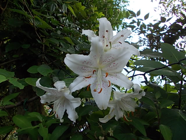 久しぶりのブログ。ここの所忙しさに暑さも加わって、ヘロヘロです。そんなある日あるおうちで、百合の花が咲いているのを発見。 さっそく取材。 いろいろな種類を植えておられました。中でも目をひいたのがこれ。 中心部がきれいな黄色なのです。初めて見ました。 紫色の百合もありました。 ちょっと終わりかけだったけどふしぎな色合いでした。 どれもとても華やかだったのですが、一番のお気に入りはというと・・・。山百合です。 ほかの百合に比べると花の大きさや華やかさに欠けるのですが、山の緑の中でこのユリを見つけると、目を奪われます。花壇で栽培されているものとは違う力強さを感じるのです。 まだつぼみをいっぱいつけていましたから、これからが見ごろなのでしょうね。栽培者が留守でしたので山百合以外の正式名はわかりませんでした。百合って本当にいろいろな種類があるのですね。