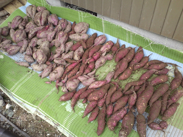 秋の味覚といえば、サツマイモ。今年も収穫できました。土佐紅金時 と、白いサツマイモです。ツルをもらったので植えてみました。シモンとかいう品種らしいのですが、本当のところは定かではありません。ライターと比べると大きさがわかるでしょうか・・・。 土佐紅金時をさっそく焼き芋に…。 しっとり、甘くて、おいしい!!きれいな黄金色です。サツマイモ、いろんな食べ方がありますが、私はやっぱり焼き芋が一番! おまけの写真。秋なのに梨の花を見つけました。葉っぱは秋色になっているこの花は可憐で、儚げ。実ることなく散っていくのでしょう・・・。