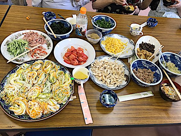 ヘルスメイトの伝達講習会 メニューはそうめんバイキング❣️ こう暑いと食欲もなくなりますよね。 そこで活躍するのが素麺。 トッピングに工夫して、 しっかり栄養をとりましょう。 とりささみの酒蒸、しいたけの旨煮、油揚げの甘煮、錦糸卵。ナスとかぼちゃの素揚げ。ワカメ、シーチキン、カニかまぼこ。きゅうりにトマト、すりゴマ。 盛りだくさんです。 調理実習、試食のあとは記念撮影。 この度は社協さんの認知予防の講習会と コラボしました。