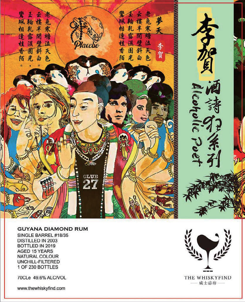 「酒詩狂 李賀 GuyanaDiamond 2003」歴史上李賀は李白と並び称される事が多く、李白は詩仙と呼ばれると共に、李賀は詩鬼と称えらています。その詩風は非常に幻想的であり、強烈な独自性に貫かれています。ラベルには、李賀も含め、27歳で亡くなった多くの著名人を。そして中身のラムは、非常に情熱的であり、かつ神秘的であり、李賀の詩のスタイルを彷彿とさせます。 ・酒類:ラム・熟成:15年・度数:49,6%・本数:230本・輸入:36本・価格:16200円税込~テイスティングノート~・Nose: パイナップル、ウッディ、ハチミツ、烏龍茶・Palate:トロピカルフルーツ、タンジェリン、パイナップル、スパイス・Finish:プラム、フローラル、ウッディ