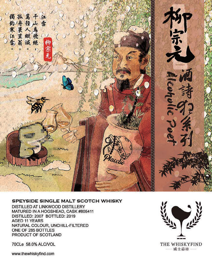 「酒詩狂 柳宗元 Linkwood 2007」柳宗元は唐代の高名な詩人。政治的には不遇を囲いました。彼の境遇と重ね合わせるかの様に、簡素な言葉の中で自然美を謡いながらも、悲哀も色濃く反映される田園詩を多く残しています。蛙食家としても有名です。 ・熟成:11年・樽:バーボンホグスヘッド・度数:58%・本数:298本・輸入:54本・価格:16200円(税込)~テイスティングノート~・Nose:ミルキー、お香、アプリコット、バニラアイス、オイリー、ウッディ・Palate:フルーティー、ウッディ、ジューシー、バランスの良さ・Finish: 軽やかなピーティーさ、ワクシー、メロン、ローストしたヘーゼルナッツ、オイリー