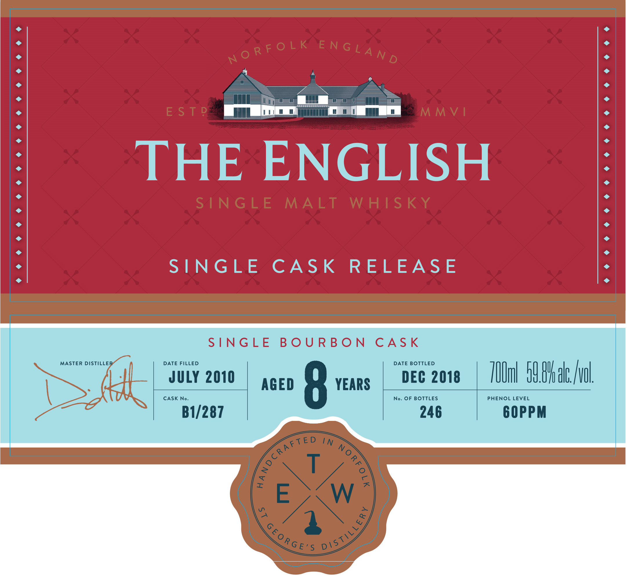 日本向けシングルカスク第一弾! ザ・イングリッシュウイスキー2010 -ヘビーピテッド 60ppm・バーボンバレル- 59.8% 700ml 9720円(税込)ザ・イングリッシュウイスキーはイングランド東部ノーフォークに創業したセント・ジョージズ蒸溜所でつくられるシングルモルトウイスキーです。この蒸溜所は2006年にプリンス・チャールズにより公式にオープンし、現在もチャールズ皇太子所有の樽が熟成されています。使用している大麦は蒸溜所から30マイルのサンドリンガム産で、このサンドリンガムには1862年から4代続く王室の私邸があり、王室と何かと縁の深い蒸溜所といえます。 ザ・イングリッシュウイスキー 2010は、今回初登場となる日本向けシングルカスクで、バーボンバレルの8年熟成。60ppmのヘビーピテッド麦芽を使用しており、シングルカスク、カスクストレングスボトリング。色は輝きのあるイエロー。ピート香は上品で、桜チップの燻製チキン、レモンピール、ホワイトペッパー。後からドライパイナップル、カスタードクリームの甘い香りが現れます。口当たりは非常にクリーミーで、焚火の煙、土っぽいピートの味わいを主体に、レモンクリームパイ、バニラクリームをたっぷりと挟んだグラハムクッキーの甘みと香ばしさが広がります。フィニッシュまでピートスモークが続き、ニシンの燻製、ユーカリオイルが加わります。着実に熟成を重ねているイングリッシュウイスキーの可能性を是非お確かめください。(インポーター資料抜粋)