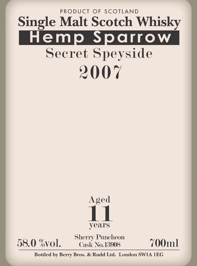 大好評を頂いておりますウィスク・イーのオリジナルシリーズ「ヘンプスパロー(Hemp Sparrow)」から、白牌「シークレットスペイサイド2007」をご案内いたします。 シークレットスペイサイド2007 / 58.0% 700ml 11786円 シークレットスペイサイド2007はスペイサイド地区のある蒸溜所のシングルモルトで、シェリーパンチョンの11年熟成。シングルカスク、カスクストレングスボトリングです。この蒸溜所は小さなローゼスの街を流れるローゼス川のほとりにある蒸溜所で、つくられるウイスキーの95%がカティサークやフェイマスグラウスなどのブレンデッドウイスキー向けに使用されています。色はアンバー。香りはたっぷりのキャラメルとアーモンドの濃厚さに、コーヒーキャンディ、ビターオレンジ、麦の甘いアロマ。味ははじめにミルクキャラメルとカフェモカが広がり、次第にサルタナレーズンやマーマレードなどの熟成されたフルーツの甘みが加わります。フィニッシュは口どけの良いダークチョコレートの味わいが長い余韻となって続きます。非常に綺麗な酒質で、シェリー樽の芳醇かつ濃厚なフレーバーを存分に味わえる1本です。是非お楽しみください。---Tasting notes---色:アンバー香り:キャラメル、アーモンド、コーヒーキャンディ、ビターオレンジ、麦味:ミルクキャラメル、カフェモカ、サルタナレーズン、マーマレード、ダークチョコレート