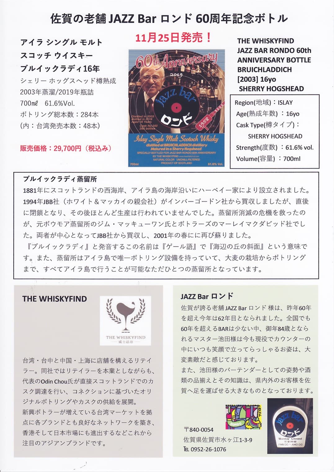 先日のウィスキーフェステバルで大好評でした佐賀のジャズバー「ロンド」の60周年記念ウィスキーが遂に入荷しました三国志でおなじみの超人気ボトラーズ「ウィスキーファインド」と「ブルイックラディー」と「ロンド」の夢のコラボ絶対に1本は確保したいウィスキーではないでしょうか(資料はインポーター参考)