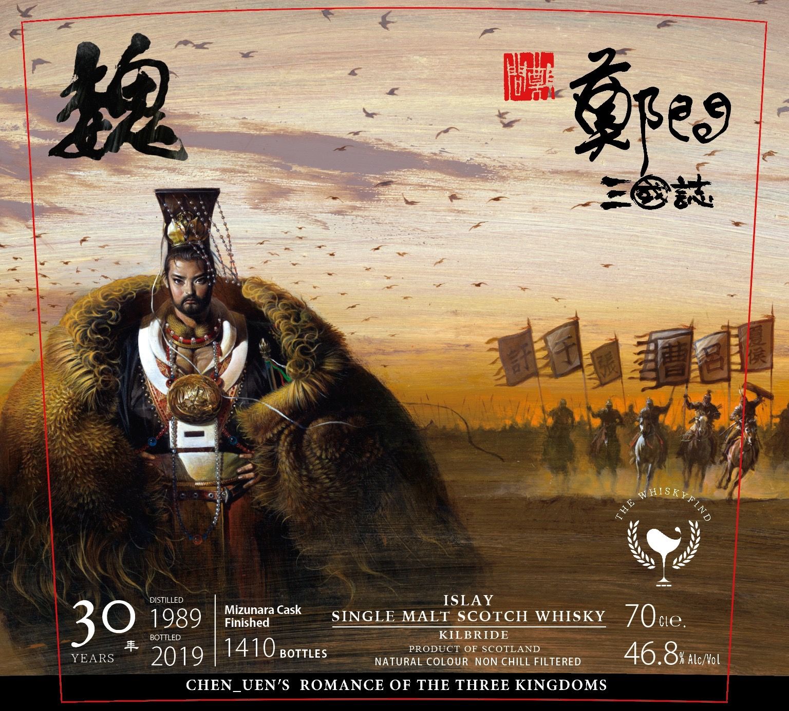 この大不況でも高額ながらもネットでも即完売の人気シリーズ三國志が入荷しました尚この商品に関する在庫の確認の電話、取り置きはお受けできませんので御了承くださいウィスキーファインド三國志今回も、高額ではありますが、とてもスペシャルな1本、ラフロイグのミズナラ樽フィニッシュを三國志にてリリース、「鄭問三國誌 曹軍百萬 Kilbride 1989 Mizunara Cask Finish」・蒸溜所:ラフロイグ蒸溜所・熟成:30年・樽:ミズナラ樽(18ヵ月フィニッシュ)・度数:46.8%・本数:1410本・輸入:(100本~300本前後?)・価格:74800円税込―――――――――――――――――――――――――――――――――――――――曹操の中国北部統一後、曹操は皇帝よりも最も権力を持ち、強くなりました。ラベルに描かれているように、優美な羽織りと王冠を身につけ、北からは百万もの兵士を後ろの従え、劉備と孫権の連合軍との戦いを始めます。このストーリーからアイラの崇高な蒸溜所=ラフロイグ、北の気高く美しい樽=ミズナラを選び、2つのエレメントを重ねあわせました。高貴で上品なウイスキー、世界初のラフロイグ・ミズナラウイスキーを創りました。 ~テイスティングノート~Nose:潮風、蜂蜜、トロピカルフルーツ、パッションフルーツ、花、フレッシュミズナラ材、魚油、牡蠣、軽やかでエレガントなピート Palate: とてもジューシーなトロピカルフルーツ、桃、蜂蜜、心地よい木の感覚、肉の感触、プラム果汁、スモークハム、ミルクチョコレート Finish:フルーティ、ネクター、エレガントでフローラル、石鹸のような余韻が続く