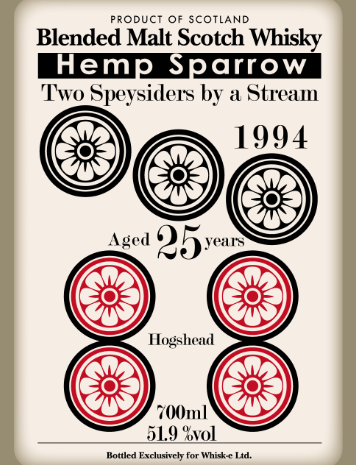 大人気シリーズ「ヘンプスパロー」 フルーティなスペイサイドのティースプーン・モルト『トゥー スペイサイダーズ バイ ア ストリーム1994』51.9% 700ml 19550円(税込) 大好評を頂いておりますウィスク・イーのオリジナルシリーズ「ヘンプスパロー(Hemp Sparrow)」から、七筒「トゥー スペイサイダーズ バイ ア ストリーム1994」をご案内いたします。 トゥー スペイサイダーズ バイ ア ストリーム1994は、現在もフロアモルティングを行っていることで知られるスペイサイドのダフタウンにある蒸溜所のモルトウイスキーを99.99%使用した「ティースプーン・モルト」で、0.01%のティースプーン分はユニークな三角ボトルで知られる蒸溜所のモルトウイスキーです。25年熟成のホグスヘッド2樽をカスクストレングでスボトリング。 色はゴールド。香りは黄桃やプラムの甘く柔らかなフルーツのアロマが溢れ、ハチミツ、日に焼けたオーク、かすかにユーカリキャンディのアクセント。味わいは完熟した桃やアプリコットの優しいフルーツテイストにオークスパイス、ホワイトペッパーのアクセントが混ざり合い、フィニッシュにビワの渋みの効いたシロップの甘味が広がります。 黄色い果実の柔らかな風味が前面に現れたおすすめのティースプーン・モルトで、25年という熟成期間を考えると、とても値ごろ感もありますので、ぜひこの機会にお楽しみください。(インポーター資料抜粋)