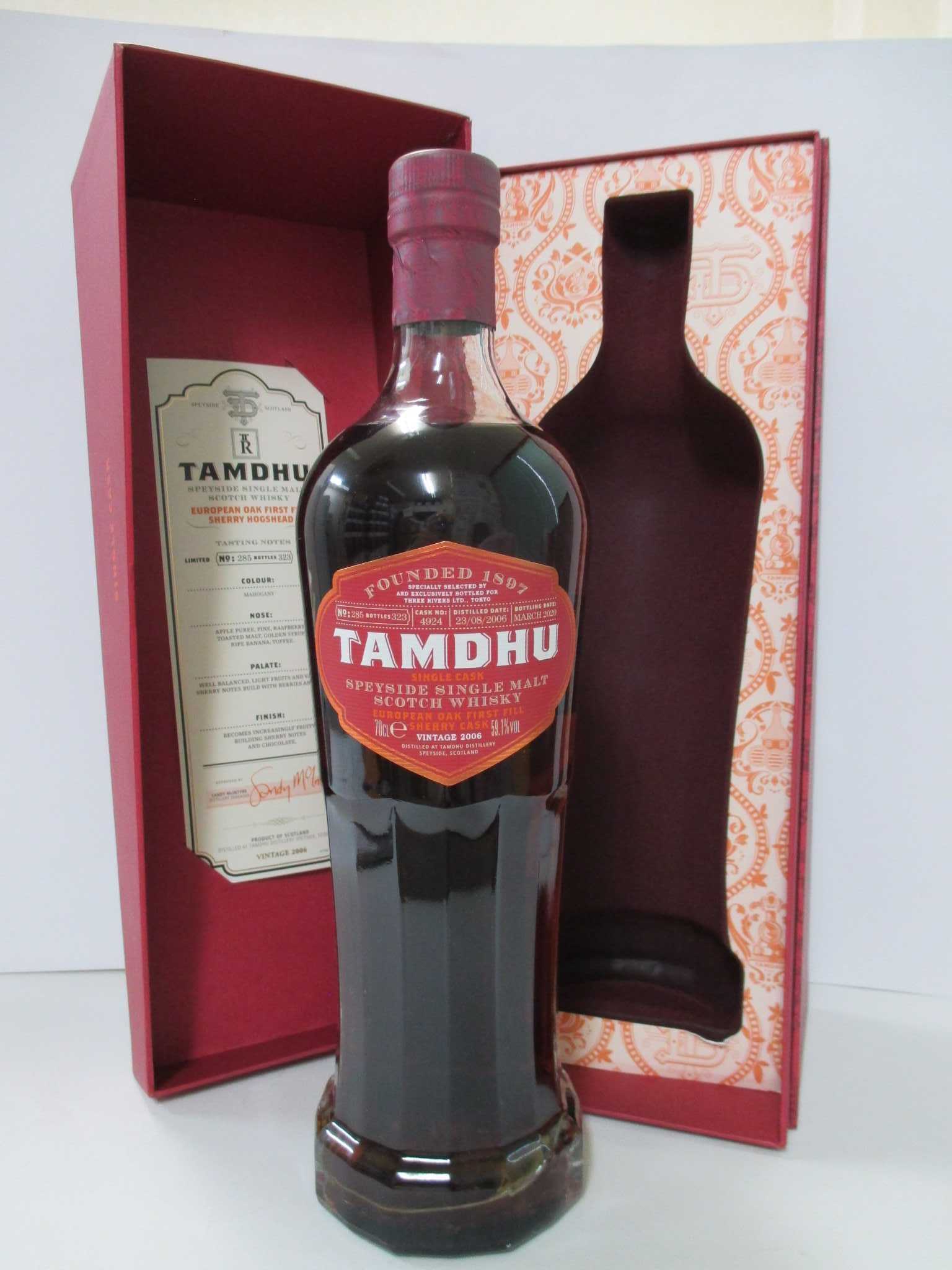 定番商品でもあまりのコスパが良く人気ですがそのタムデューから限定品が出ましたかなり受注オーバーしたようですがかろうじて少しだけ入荷しました定番であれだけ旨いなら絶対旨いに決まってます!!~遂にリリース 100%シェリーカスク熟成にこだわったスペイサイドの銘酒! タムデュ-蒸留所オフィシャルボトル スリーリバーズ向けシングルカスク往年のクラシカルなシェリーカスクテイストを纏い堂々入荷!~今回は昨年定番商品として取り扱いを開始いたしましたタムデュー蒸留所のオフィシャルボトルの日本市場限定、スリーリバーズ向けシングルカスクを日本の皆様にご紹介致します。タムデュー蒸留所は1897年に設立されました。設立当初からスペインから高品質のシェリー樽を調達してシェリー樽100%熟成を行い、設備の近代化と生産能力の増強を図りながら、1970年代のウイスキーブームに乗じて生産量を増大させましたが、残念ながら2010年には蒸留所が閉鎖されてしまいました。そして2012年に現オーナーであるイアンマクラウド社が買収し、タムデュー蒸留所の設立当初からのポリシーとレガシーをそのまま引き継ぎ、最高のウイスキーを造るべく生産を再開しました。もちろん高品質のシェリー樽100%熟成という伝統を守りながら、100年以上経った今も同じ製法で最高のスペイサイドモルトをリリースしています。定番商品以外にも不定期でシングルカスクの限定品をリリースしているのですが、ウイスキーマガジンのワールドウイスキーアワード2020年において「ワールドベストシングルカスクシングルモルト」にタムデューの2003年シングルカスクが選ばれました!そんな世界が認めたシングルカスクの、今回は待望のスリーリバーズ向け限定品のご紹介です。タムデュー蒸留所からサンプルを取り寄せ厳選した一樽が、この2006年ヴィンテージのヨーロピアンオークのファーストフィルオロロソシェリー樽です。カラーは見事なディープマホガニー、香りは湿った葉巻、レーズン、カカオビター、ベリー、味はリッチで芳醇なファーストタッチ、ミルクカカオ、レーズン&ベリー、ホットなトフィー、フィニッシュはスパイスとカカオビターが長く続きます。香りからクラシカルなシェリーカスクを彷彿。期待通りのテイストは素晴らしくリッチで大人の色気に溢れています。求めていたクラシカルなシェリー樽熟成の世界を堪能下さい!以下にオフィシャルテイスティングノートを記載しましたのでご参考にしてください。TAMDHU 2006 –2020 SINGLE CASK for THREE RIVERSEUROPEAN OAK 1st FILL OLOROSO SHERRY CASK 59.1% 70cl日本市場限定323本 オフィシャルテイスティングノート – 色はマホガニー。香りはリンゴのピュレ、パイナップル、ラズベリー、焼いたモルト、ゴールデンシロップ、熟れたバナナにトフィー。味はバランスが良く、ライトなフルーツとバニラ、シェリー酒にベリー系とスパイス。フィニッシュは徐々にフルーティになり、後からシェリー酒とチョコレート。29500円(税込)