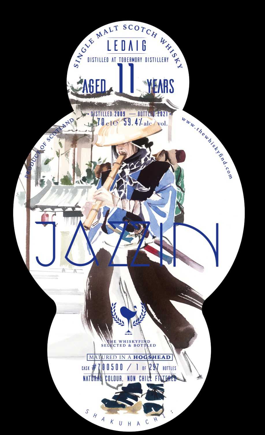 この度は、とても久しぶりになりますが、ウィスキーファインドからの新着商品のご案内させて頂きます。 今回は、ミドルレンジシリーズとして、毎回高評価を頂いております「JAZZ」 JAZZIN – Shakuhachi Ledaig 11yo・Distilled: 2009 ・Bottled: 2021・Cask Type: Hogshead・Cask No.: 700500・度数:59.4%・本数:297本・輸入:72 本・価格:16500円税込~概要~このレダイグは、表面はピーティーでありながら、内面はとてもフルーティーで上品なウィスキーです。その味わいは、現世と精神世界の狭間で虚無僧が尺八を吹いている姿を思い出させました。 ~テイスティングノート~Nose: 潮風、オイスター、ベーコン、レモンピール、バタースコッチケーキ、バニラ、ピーティーPalate::モカ、ベーコン、ミネラル、コースタル、フルーティーFinish: vanilla, custard, peaty and ashy