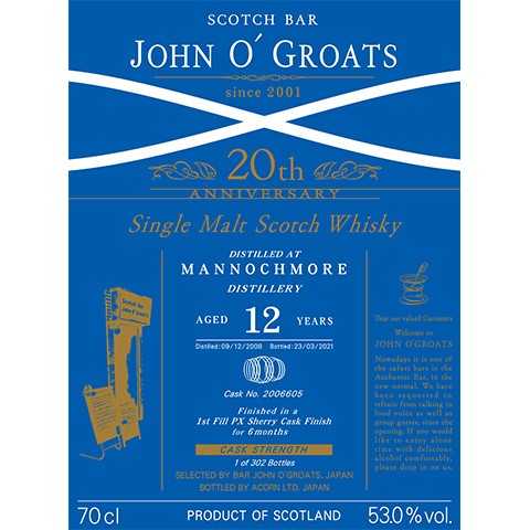 ウィスキー「ガロア」でも有名な地元埼玉の有名bar「ジョン オグローツ」の鈴木氏の記念ボトル自分も以前鈴木氏の講師で勉強会に参加し試験に合格した思い出があるだけに当店の棚に並べられ大変光栄に思います埼玉県の草加は、日光街道の第二の宿駅で、松尾芭蕉の「おくのほそ道」にも、この地名が登場します。現在では複数の鉄道路線が相互直通運転を開始し、都心への利便性が格段に向上しています。その草加の地で2001年にスコッチバーをオープンした『ジョン・オグローツ』が、今年20周年を迎えました。 オーナーバーテンダーの鈴木勝二氏は、ウイスキー文化研究所が認定する「マスター・オブ・ウイスキー」を取得した逸材です。大学時代に徒歩で英国・グレートブリテン島を縦断。ゴールとなったスコットランド最北の村の名が店名の由来。店内に取り揃えられたウイスキーは1,000本以上。鈴木氏のキャリア然り、店の在りようについても然り、ウイスキーへの情熱の深さを感じさせるプロフェッショナルとして各方面で活躍中です。そんな鈴木氏が、20周年を記念してボトリングしたこの1本を試さずにはいられません。 マノックモア2008 12年 53.0% 700ml【スコッチバー ジョン・オグローツ20周年記念】 14,850円 (税込) 【テイスティングノート 鈴木 勝二】<アロマ>温州みかん、カンロ飴、マーマレード、ハニーナッツ、道端のタンポポと犬ふぐり。フルーティーで温かみがある。<フレーバー>ザラメ、尖ったメープル、ザクロ、オレンジピール、ミントキャンディー。粗削りだが複雑。酒質と樽感の際どいバランス。<総合評価>やんちゃでとっつきにくいが、経時で変化する顔も面白い。一本の底まで長く付き合えば、良い友になれそうだ。 鈴木 勝二 SHOJI SUZUKI第2代マスター・オブ・ウイスキー1969年福島県生まれ。埼玉県草加市にある「Scotch Bar John O’Groats(ジョン・オグローツ)」オーナーバーテンダー。“気がついたら好きになっていた”というほどウイスキー好き。バーには1000本以上のウイスキーを揃える。ウイスキーエキスパート、プロフェッショナルともに第1回で合格。2014年には最難関のマスター・オブ・ウイスキーに合格している。現在はバーテンダーとして活躍するかたわら、ウイスキー検定対策講座講師、ウイスキー専門誌『ウイスキーガロア』のテイスターを務めている。 [ウイスキー研究所 ウイスキーコニサー資格認試験より引用]