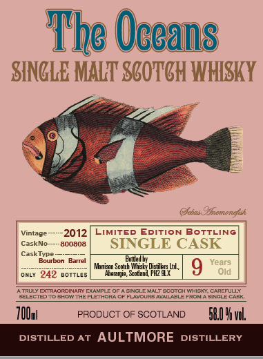 オーシャンズ『オルトモア2012』ジューシーなフルーツの旨味を湛えたシングルカスク ウィスク・イーのオリジナルシリーズ「オーシャンズ」の第28作目をご案内いたします。今回のシングルモルトはスペイサイドの「オルトモア2012」です。 オルトモア2012 58.0% 700ml 9500円(税込)オルトモア2012はバーボンバレルの9年熟成で、シングルカスクのカスクストレングスボトリングです。 色は輝きのあるゴールド。香りはゴールデンシロップの甘いアロマに白ブドウ、熟した青リンゴが混ざり合い、アーモンドスカッチへと変化して行きます。口に含むと熟れた和梨のジューシーな味わいにビワや黄桃が加わります。フルーツの味わいの奥からトフィーやオークが顔を覗かせ、ピンクペッパーがアクセントに加わり、暖かみのあるフィニッシュを迎えます。 9年とまだ若いですが旨味をたっぷりと蓄え、エステリーで滑らかな口当たりが素晴らしいシングルカスクです。ぜひこの機会をお見逃しなく。 今回のラベルは、セバエアネモネフィッシュです。 ●限定242本