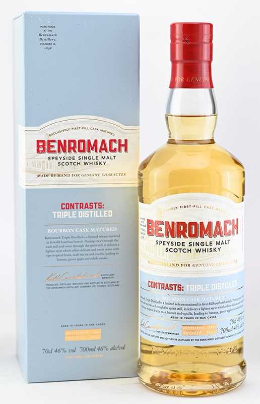 右肩上がりで出荷量が伸びているベンロマック!定番の10年はもちろん、ピートスモークやオーガニックといた限定ラインの商品も毎回大変ご好評をいただいており、品薄が続いております。そして今月、また数量限定生産となる商品が到着いたしました。旧ラベル時代にも限定品としてリリースがあった人気商品、「トリプル・ディスティルド」が新パッケージでは初めての登場となりました。今回は2011年ビンテージでファーストフィルのバーボンバレルにて熟成された、定番ラインとは180度趣の異なるユニークな商品です。その名のとおり、ローランド地方などで見られる3回蒸留を施したアイテムで、初留釜で1回、再留釜で2回の蒸留を行うことで、通常のベンロマックとは異なる、やや軽めですっきりした味わいに仕上がっています。ローランドの代名詞的手法ですが、今や同地区のモルトは入手できるものも限られており、スペイサイドの王道的モルトを作るベンロマック蒸留所が育てた3回蒸留品となれば、飲まないわけにはいかないでしょう。なお、こちらは定期生産品ではなく、今後のリリースも現時点では全くの白紙、蒸留所にも残在庫はありませんので、見逃すと当面は入手できない稀少な限定ベンロマックです。日本割当もわずか、ぜひとも確保いただきたい商品です。お早目に!<テイスティングコメント>[香り]新鮮なトロピカルフルーツからモルトビスケット、こくのあるバニラのさや、焦がしオークへと変わっていく。[味わい]完熟バナナが火を通した洋ナシと混じり合う。青リンゴが甘いハチミツを伴って変化する。[フィニッシュ]柑橘系の表皮や穏やかなスモークを伴ったミディアムボディの長いフィニッシュ。 ベンロマック トリプル・ディスティルド 2011 容量:700ml 度数:46度 8600円(税込)