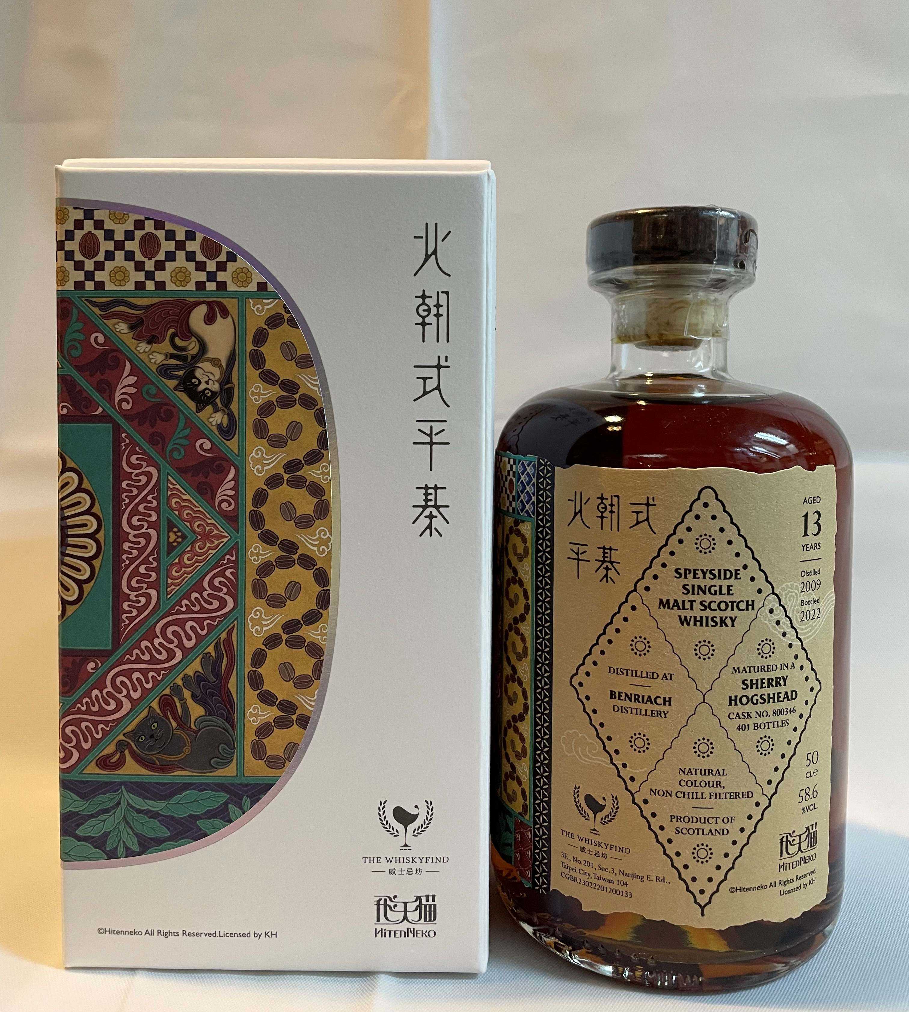 Hiten Neko Benriach 2009 13年 58.6% 500ml 25300円(税込)・Distilled: 2009 ・Bottled: 2022・Cask Type: Sherry Hogshead ・Cask No.: 800346・本数:401本 ・輸入:84本~概要~今回のラベルは、シルクロードの文化財として有名な敦煌石窟内天井の壁画がモチーフ。4匹のHiten猫は、コーヒー豆、チョコレート、ドライフルーツ、シナモン、、、、ウィスキーの美しきフレイバー、そして願いと共に華やかに描かれています。~テイスティングノート~・Nose:ドライフルーツ、マーマレード、シナモン、パッションフルーツ、マンゴー、コーヒー豆、チョコレート、タバコの葉、スパイス・Palate:チョコレート、パッションフルーツ、オレンジ、ピーチ、ドライフルーツ、スパイス、タバコ・Finish:ドライフルーツ、チョコレート、コーヒー豆、ミネラル