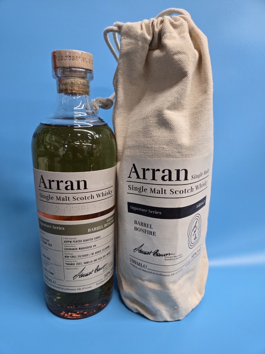 アラン 11年 バレル ボンファイア 700ml 50度 シグネチャーシリーズ エディション2 並行 18900円 (税込) 14,822本限定 シグネチャーシリーズは4部作の限定シリーズ第2弾。すべてのエディションはディスティラリーマネージャーのスチュアート・ボウマンが原酒を厳選し、ラベルには彼の承認印である署名が記されています。第2弾のバレル ボンファイアはBonfire(=たき火)の名前から推測できるように、ピートを追求したものになっており、フェノール値42ppmのピーテッド麦芽を使用したリッチでドライなスモークの香りが特徴です。バーボン樽で5年半熟成後シカゴコ―ヴァル蒸留所の115リットルサイズのクォーターカスクで5年半追熟香り:キャラメルでコーティングされたヘーゼルナッツ。オレンジの皮と豊富なバニラ。濃厚なドライスモーク。味わい:豊かで滑らか。食欲をそそる、油性で複雑。スパイシーなシナモンノートが柑橘類と混ざり合うフィニッシュ:スパイス、シトラス、スモーク、ピート、バニラ、シナモン、スムース、トーストオーク
