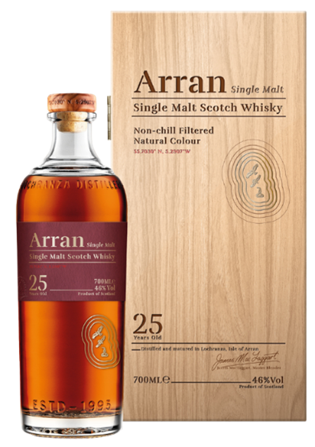 ロックランザ蒸溜所の最高峰25年熟成!限定商品『アランモルト25年』 ★ロックランザ蒸溜所(旧アラン蒸溜所)Isle of Arran Distillers社所有の蒸溜所で、1995年にスコットランド・アラン島のロックランザ村に誕生。昨今世界各地で産声を上げているクラフト蒸溜所のパイオニアとして知られており、小型の4基(2対)の蒸溜器で丁寧に蒸溜を行っています。 アランモルト25年 46% 700ml 95300円(税込)【限定数:300本】総ボトリング数:3,000本 木製BOX付 バーボン樽熟成原酒(65%)とシェリー樽熟成原酒(35%)をヴァッティングし、12ヵ月間シェリーホグスヘッドで追熟した25年熟成です。毎年3,000本のみボトリングされる限定商品で、今回日本への入荷は300本。 香りはドライイチジク、サルタナ、甘く熟したブラックチェリーのアロマと共に豊かなオーク、ほんのりナツメグが感じられます。味わいはトーストしたアーモンドとシナモンの入ったフルーツケーキ。マンダリンオレンジやマヌカハニー、ブラウンシュガー、焼いたアプリコット、ホワイトペッパーが絶妙に絡み合い膨らみのある味わいが広がります。フィニッシュにかけてダークチョコやダークフルーツのコンポートへと変化し、スパイスの効いたクリーミーな余韻が広がります。 高級感溢れる木製BOXの特別仕様です。アランの25年の歴史が感じられる複雑で奥行きのある味わいをご堪能ください。