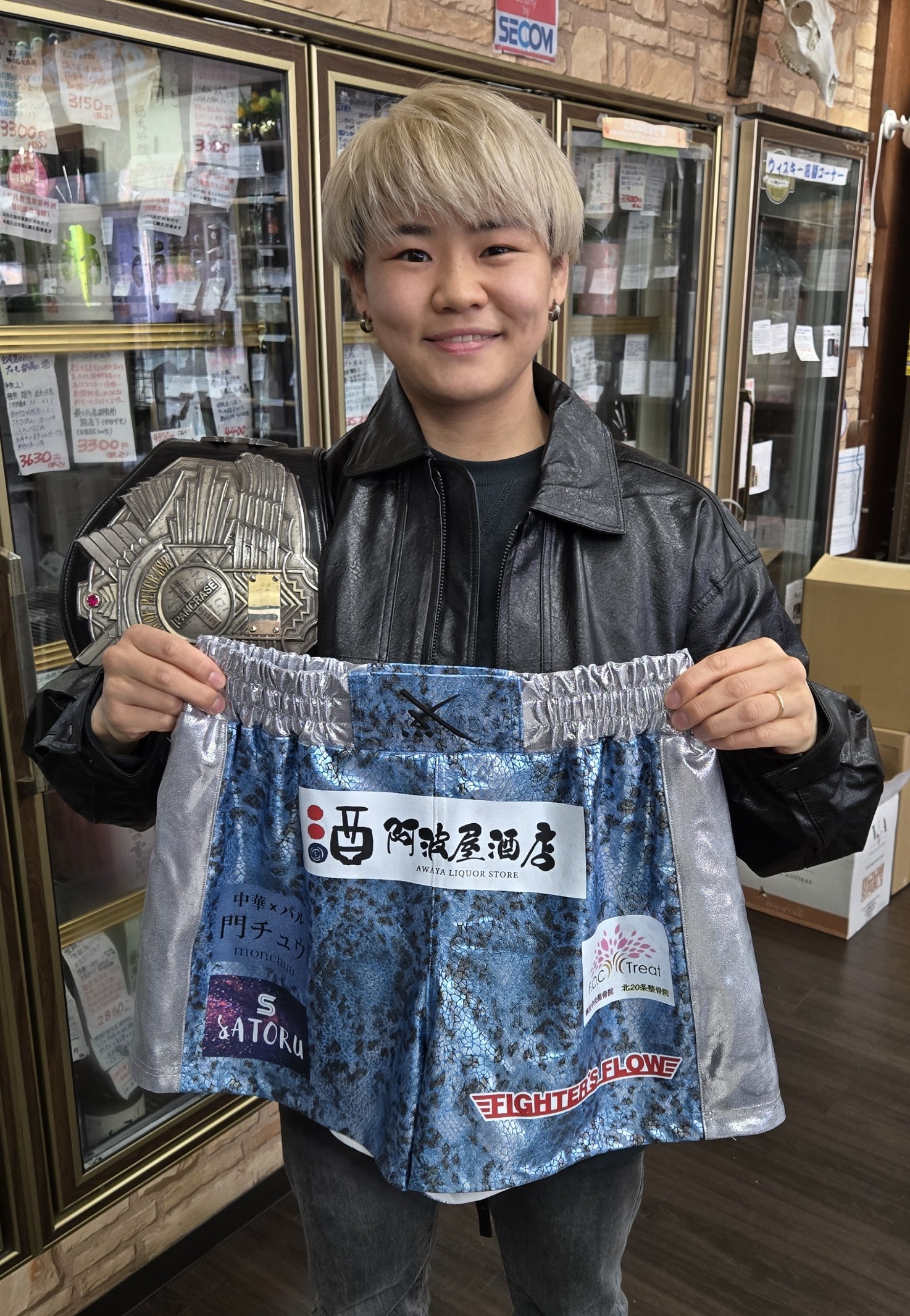 昨日見事に杉山選手に勝利し第五代キングオブパンクラス女王に輝いた渡邊史佳選手がベルトとパンツを持って御来店いただきました。早速ベルトを触らせていただきましたが初めてベルトを触り格闘技ファンの店主は感動してしまいました。早速強豪外国人等から挑戦依頼もきて多くの有名団体からもオファーがきてるそうで王者になるのも大変ですがこれからはベルトを維持し戦うのも大変だと思いますが是非1回でも多く防衛し絶対王者でUFCに挑戦していただきたいと思います。これからも田島椋選手共々応援していきたいと思います
