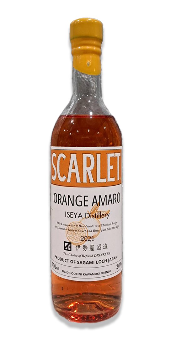 少量入荷の為参考紹介とさせていただきます。大変申し訳ございませんスカーレット オレンジアマーロ 2025 20度 700ML ¥3,850税込「Amaro:アマーロ」とはイタリア語で【苦い】を意味し、【苦味】を帯びたリキュールの総称で日本にも古来より「良薬口に苦し」という言葉があるように、薬として何がしかの効能を求め製造された歴史があった。伊勢屋酒造が手がける「SCARLET」に欠かせないキーボタニカルがあります。それは、丹精込めて育てられた“オレンジ”です。「Aperitivo」や「Cask Marriage」には、その果皮(PEEL)のみが使用され、果肉(JUICE)は使われません。本来なら廃棄されるはずの副産物に新たな命を吹き込んだのが、伊勢屋酒造代表・元永氏と、総勢70名の有志たち。彼らは1,200kgものブラッドオレンジを手作業で皮むきし、ジュースを搾りました。搾り切った果肉は伊勢屋酒造の畑の肥料となり、その栄養が新たなボタニカルを育む土壌となります。サステナブルという言葉だけでは語り尽くせない浪漫と人々の想いが、この「SCARLET」には宿っています。新鮮なブラッドオレンジを手搾りし、そのまますぐにタンクで生成しているため、果実味をダイレクトかつフレッシュに感じられる仕上がりです。まずはストレートでその味わいを堪能し、インスピレーションのまま、さまざまなカクテルアレンジもお楽しみください。瓶底には澱(凝縮された成分)が生じることがありますので、お好みで撹拌し、味の違いもぜひご体験ください。【使用ボタニカル】草:レモンバーム、ホウズキの葉 など根:エゾウコギ、ジンジャー など木:シナモン皮:ブラッドオレンジ花:ツバキ全15種類のボタニカルを使用しています。※開封後は高温・直射日光は避けて保存下さい。 【伊勢屋酒造】神奈川県相模原市緑区(東京都と山梨県の境目にあり、都内からは電車で約1時間)に位置し、甲州街道9番目の宿場町小原に現存する、築100年の古民家を再生し製造場とした。造られるリキュールの製造方法は古典的で、また製造から瓶詰まで全てハンドメイドでおこなわれる。伊勢屋酒造代表 元永達也渋谷のウィスキー・バーCaol Ilaにて店長を歴任。その後、新宿「ベンフィディック」や台湾「和酒」、中国のゴールデンプロミスの姉妹店「ウイスキーキャット」にて勤務し、ウィスキーをはじめ、カクテルにも造詣が深い。その後、ヨーロッパを周遊中にスコットランドの蒸留所を始め70カ所ほど見学。造り手の奥深さ、その土地の風土を生かしたお酒または農業の有様を体験、目の当たりにする。特に、フランスとスイスの国境に位置するポンタルリエ、スイスの町(トラヴェール)の自然や人柄に魅了される。