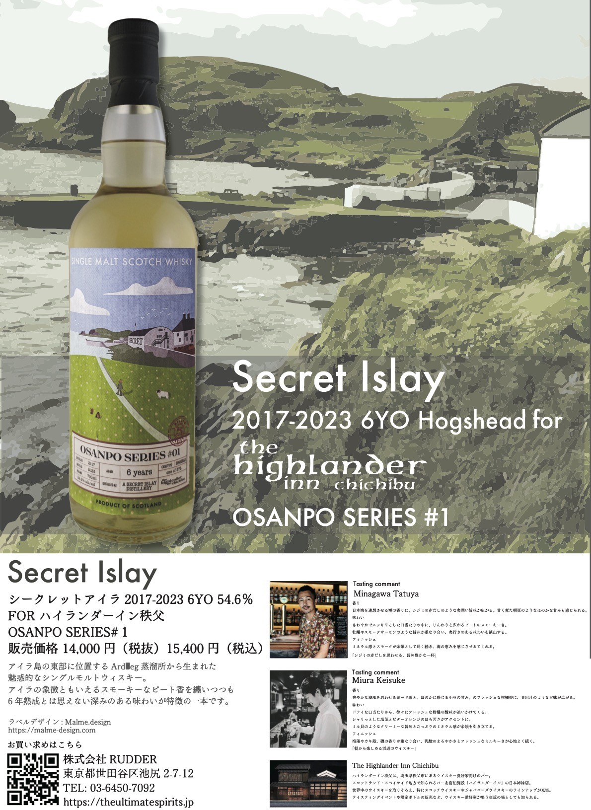 シークレットアイラ(キルダルトン) 2017 6年 ホグスヘッド OSANPO SERIES #1 15400円(税込)Highlander Inn Chichibu向けプライベートボトリングの新シリーズ第1弾。アイラ島の東部に位置するArd⚪︎eg蒸溜所から生まれた、スモーキーなピート香が魅力のシングルモルトウィスキー。6年熟成ながらも奥深い味わいを備え、アイラの個性を存分に楽しめる一本です。