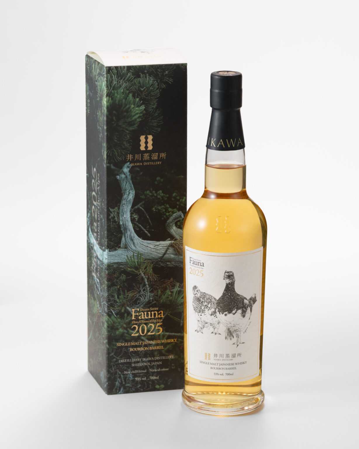 ファーストリリースに続き、第二弾はシングルモルト初となるピートタイプのウイスキーです。井川蒸溜 所のキーモルトであるノンピートタイプのバーボンバレル原酒をベースに、フェノール値50ppmと 30ppmのモルトで製造した原酒をブレンドしたミディアムピートタイプのジャパニーズウイスキーです。 ピートタイプであるFaunaラインのラベルは南アルプスの動物をモチーフにしており、世界南限種であ るライチョウを採用しています。 ※Dessin Series Flora & Fauna とは…、 井川蒸溜所を取り巻く南アルプスの環境は永い時間を経て様々な生き物によって調和した生態系を 保っています。ウイスキーも同様に、造り手による原酒づくりをはじめ様々な原酒のブレンドにより香り や味が調和した状態を創り上げています。これらに共通する「調和」が私たちの目指す12年物のウイ スキーであり、それまでのプロセスを表現したものが本デッサンシリーズです。これに続くリリースは、 これらの調和を構成する要素を南アルプスの生態系の種で表現しシリーズのラベルに付与していき ます。ノンピートモデルのFlora(=植物モチーフ)と、その対となるピーテッドモデルのFauna(=動物モ チーフ)が集まり、徐々に私たちの目指すビジョンを完成させていきます。 タイプ ピーテッドウイスキー 熟成樽 バーボンバレル(1st) 加水 木賊湧水 冷却ろ過 ノンチルフィルタード(70μ) 着色 ナチュラルカラー井川蒸溜所 シングルモルト デッサンシリーズ ファウナ 2025 53度 700ML 19800円(税込)