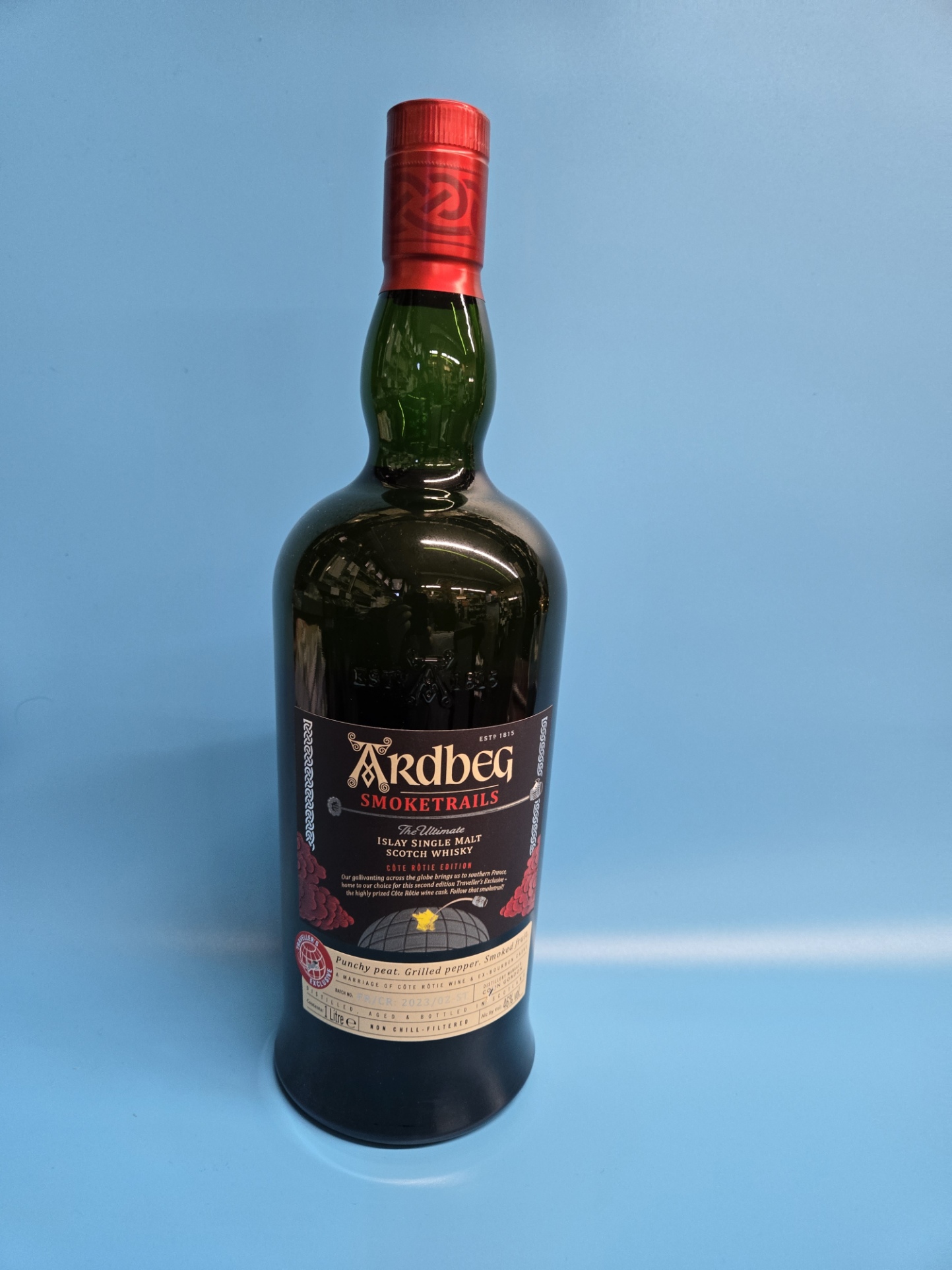 免税店限定アードベッグのトラベラーズ・エクスクルーシブ・シリーズ2弾フランス ローヌ地区コート・ロティの赤ワイン樽熟成後バーボン樽でマリアージュ。 「アードベッグ スモークトレイルズ コート・ロティ エディション」46度 1L 12000円(税込)