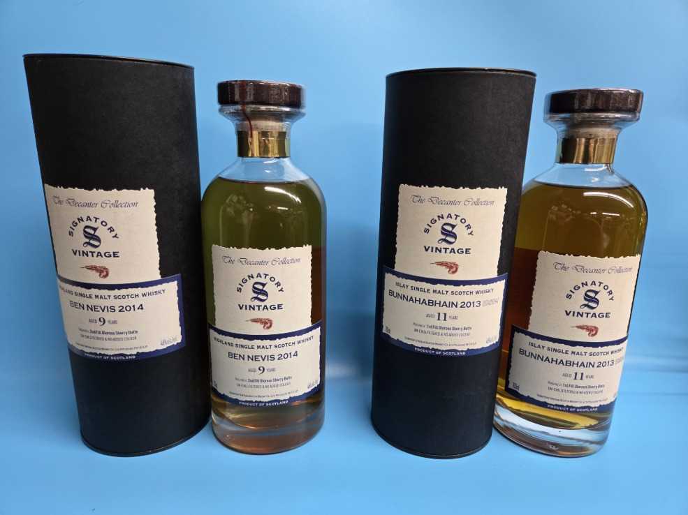写真 左からシグナトリーヴィンテージ ベンネヴィス 2014 9年 イビスコ・デキャンタ 46% 700ML 2nd Fill Oloroso Sherry Butts 9150円(税込)シグナトリーヴィンテージ ストイーシャ 2013 11年 ヘヴィリー・ピーテッド イビスコ・デキャンタ SV 46% 700ML 1st Fill Oloroso Sherry Butts 11400円(税込)