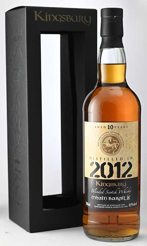 キングスバリー社は2013年より、「メインバライル(Mhain Baraille)」というゲール語でONLY BARREL、つまり「シングルカスク」を意味するブレンデッドウイスキー」を発売しシリーズを重ねていますが、どれも価格以上の価値を持つ秘蔵の原酒が使われているのが特徴です。その初リリースから、ウイスキー・ワールド誌においてその年のベストウイスキーにも選ばれたほどで、その後もリリースの度、その素晴らしい味わいは多くの方々より大変ご好評をいただいております。今回は、バット熟成のしっかりとした色合いを持つ、このシリーズとしては破格のハイコストパフォーマンスアイテムが登場してきました。誰もが知っているエドリントン系モルト達を主要原酒にしているブレンデッドウイスキーで、蜂蜜、フルーツ、ナッツをふんだんに感じさせる秀逸な仕上がりです。中身のモルト銘柄に関してはシークレットですが、「スペイサイド、オークニー、ハイランド」の大人気優良蒸留所のものということです。名前こそシークレットですが、その実力、品質は決して色褪せないものです!10年とは思えないしっかりした熟成感と飲み応え、そして何と言ってもお求めやすいこの価格!バーなどでは1本あると重宝する使い勝手のいいウイスキーです。バット熟成で生産数もしっかりあるので、オンメニューしても使える超推奨ボトルです。1本買えば開栓後に絶対もう1本欲しくなること請け合いです。<テイスティングノート>あたたかみのあるゴールドの外観。ヘザー、はちみつ、果樹のリッチな香り。口にしてもリッチでフルーティで、トフィーアップルバニラややわらかいオークが感じられ、ヘーゼルナッツやバタースコッチも現れる。フィニッシュは長く、スパイシーなジンジャーやはちみつの余韻が続くメインバライル 2012 10年 / キングスバリー ゴールド容量:700ml 度数:49.5度 7770円(税込)