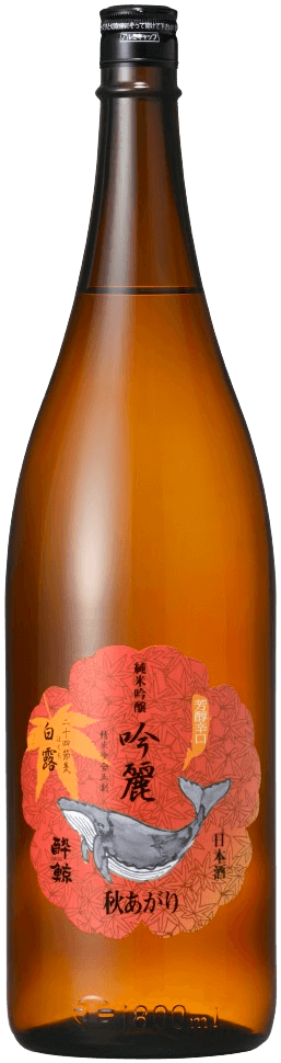 酔鯨 吟麗 純米吟醸 秋あがり 1,8L 3124円(税込)ひと夏を超えたお酒の味わい、こだわりの低温貯蔵でじっくり熟成吟醸酒の主力商品「純米吟醸 吟麗」の一部を低温貯蔵し、秋に出荷致します。原料米には吟風を使用し、自社酵母でじっくり醸造しました。清酒は寒造りしたものを貯蔵し、夏を越えることにより味の熟成が進み、秋を迎える頃には、深い味わいを感じて頂けます。貯蔵方法を瓶貯・低温貯蔵としたことにより、味のバランスを崩さずに綺麗な熟成が可能となりました しっかりした旨みとキレの良い後味が特徴です。麹をしっかり造ることにより素材の旨みを引き出し、これに酔鯨特有の酸味を組み合わせ、旨みと後味の良さを両立しました。また低温熟成することにより、味の幅が広がり、旨みをじっくり感じていただけるお酒に仕上げました。吟風(北海道) 精米歩合 50% アルコール度数 16度 日本酒度 +7 酸度 1.7 アミノ酸度 1.3