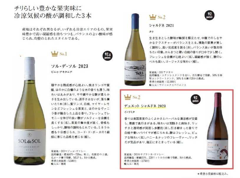 ワイン&スピリッツ専門誌「WANDS 7&8月号」(最新号)の「WANDS BUYER’S GUIDE チリのシャルドネ特集」にて「インドミタ デュエット シャルドネ」が92ポイントで堂々の第2位にランクインしました!圧倒的コスパ!「インドミタ デュエット シャルドネ」今回の「WANDS BUYER’S GUIDE」では、数々のチリ産シャルドネがブラインドテイスティングされ、その中で「インドミタ デュエット シャルドネ」が92ポイントを獲得し、第2位という高評価をいただきました。トップ4は以下の通りです。1位:ビニャ・アキタニア ソル・デ・ソル 92.5pts 希望小売価格:5,000円+税2位:タラ シャルドネ 92pts 希望小売価格:11,000円+税2位:インドミタ デュエット シャルドネ 92pts 希望小売価格:2,500円+税4位:モンテス・アルファ スペシャル・キュヴェ シャルドネ 91pts 希望小売価格:5,000円+税 1位とはわずか0.5ポイント差、そして同着2位のワインや前後ランクのワインと比較しても、「デュエット」の価格は半額以下! まさにその「圧倒的コスパ」がプロの目にも証明されました。 ■「WANDS BUYER'S GUIDE」とはワイン&スピリッツ専門誌「WANDS」がプロ向けに実施する企画です。専門家が特定のテーマのワインをブラインドテイスティングし、詳細なコメントと点数で評価します。市場トレンドや仕入れに役立つ、客観的で専門性の高い情報を提供することで、ワイン業界のプロフェッショナルから絶大な信頼を得ています。テイスターには「ロオジエ」シェフソムリエの井黒氏も参加!商品名:インドミタ デュエット プレミアム シャルドネ産地:チリ、カサブランカヴァレー品種:シャルドネ100%タイプ:白/辛口熟成:228リットルの小樽で8か月熟成容量:750ml 希望小売価格:2,500円+税現行VT:2024各テイスターからのテイスティングコメント井黒氏:香りは南国果実のふくよかさとハーバルな清涼感が交錯し、複雑で奥行きがある。味わいは芳醇さと爽快さ、リッチさと透明感が同居し多層的。名越氏:引き締まった香りで白桃や青いパパイヤが感じられる。酸はフレッシュ、ピュアな味わい。柳氏:ハニー&ナッツのフレーヴァー。リッチだが気品があり、端正にまとまっている。■次世代のチリワインを牽引するワイナリー『インドミタ』「インドミタ」は2001年設立。チリで今最も活気のある産地のひとつ「カサブランカ・ヴァレー」と、チリの銘醸地「マイポ・ヴァレー」に500haを超える自社畑を所有し、冷涼な気候と豊かな土壌を活かした高品質なワイン造りを行っています。ブドウ栽培においてはサステナビリティなワイン造りを重視し、環境に配慮した農法を実践。それぞれのブドウ品種が持つポテンシャルを最大限に引き出すため、土壌や気候に合わせた丁寧な栽培管理を行っています。・「インドミタ グラン・レゼルバ カベルネ・ソーヴィニヨン2014」が権威ある米国ワイン誌「デキャンター」にて最高賞インターナショナルトロフィーを受賞!・「インドミタ ミュゼット ロゼ」が日本のワイン審査会「サクラアワード」で全体の上位約1%であるダイヤモンドトロフィーを受賞!・「ムンドゥス・ヴィニ 2025 スプリング・テイスティング」において、「最優秀チリ生産者賞」を受賞!など、世界的な評価を確立している次世代のチリワインを牽引するワイナリーです。■「インドミタ デュエット」シリーズのご紹介「デュエット」は、インドミタが所有する2つのヴァレー(カサブランカ・ヴァレーとマイポ・ヴァレー)が奏でる二重奏をイメージして名付けられた、最高級ブドウから造られるプレミアムシリーズです。圧倒的なボリュームと複雑さを持ちながらも、非常にエレガントなスタイル。数年熟成のポテンシャルも秘めた驚くべきワインです。 飲みましたがメチャメチャ旨く2000円代とは思えない旨さ商品名:インドミタ デュエット プレミアム カベルネソーヴィニヨン&カルメネール産地:チリ、マイポヴァレー品種: カベルネソーヴィニヨン60%、カルメネール40%タイプ:赤/フルボディ熟成:228リットルの小樽で12ヶ月熟成容量:750ml 希望小売価格:2,500円+税現行VT:2023 チリの銘醸地マイポヴァレーを代表するカベルネとカルメネールの良いところを相乗させて最大限に引き出したプレミアムワイン。12ヶ月もの間フレンチオークで熟成されたその味わいは実にエレガント。チリワインの真骨頂をお楽しみいただけます。