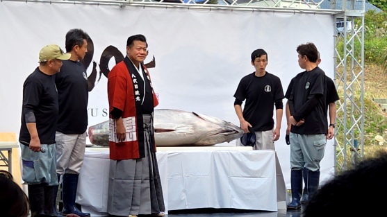 両端には名店の料理屋さん10軒位のブースで立食パーティー開催され途中鮨施設内の鮨三心さんによりマグロの解体ショー
