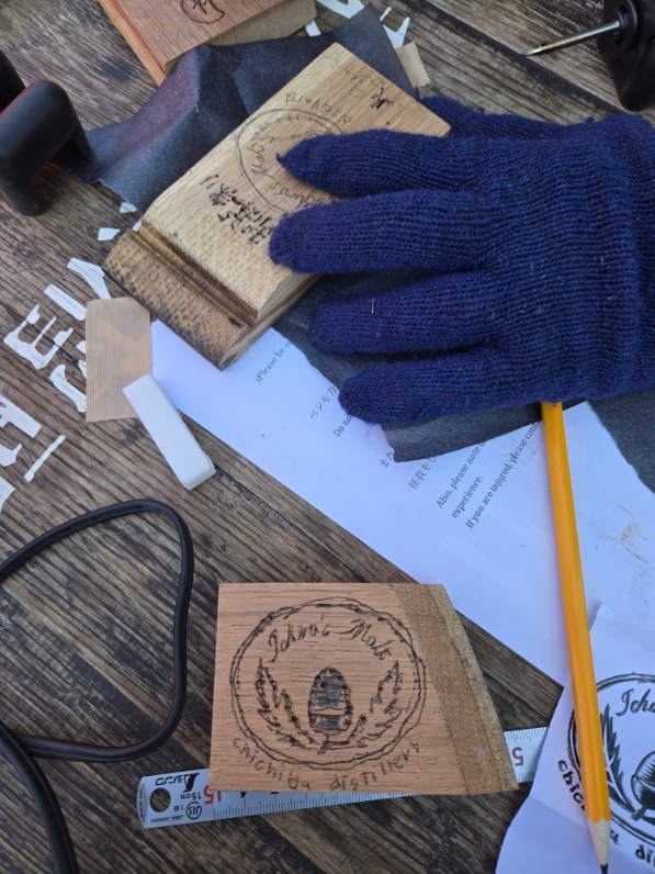 外でやってた樽材に焼きを入れる作業にSさんとチャレンジイチローズモルトのマークを書きました