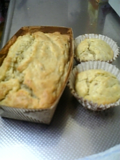 皮がかなり黒くなってきたバナナが数本残っていたので、バナナのケーキを作ることに。と思ったところで、明日の朝食用にと思い直し、砂糖抜きでケーキを作ってみた。材料:薄力粉、バター、卵、バナナ、ベーキングパウダー分量:全て適当(爆)バターを溶かして卵、潰したバナナと混ぜて、粉を加える。型に入れて焼く。以上。夕飯を作りつつ、適当に。バナナはアサヨが潰した。今回はままなのさんに頂いたパウンド型を使用。(ままなのさん、見てる~? 笑)それでも生地が余ったので別のカップに2個。小さい方をさっき食べてみると、熟したバナナの甘味が感じられて、砂糖無しでもよかった。砂糖が無くてもお菓子ってできるんだぁ・・・