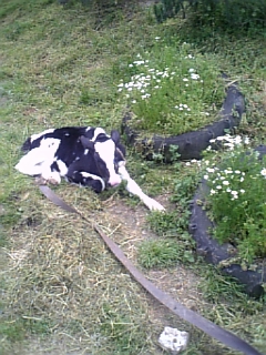 休み2日目。朝、ゴミの収集をめぐってマンションで色々とあって、時間をとられた。その後、冬物の洗濯をしたりして午前中は終了。今日1日はお天気がいいとのことなので、どこかに行かねば、ということで今日の目的地は弓削牧場。以前から行ってみたいと思いつつ、行ったことがなかったところ。うちから車で30分ほどで到着。こんな住宅街に牧場??って感じのところに突如現れた。いわゆる観光用の牧場ではないので、そんなに広くはないし、1日中のんびりと過ごす、というような場所ではないけど、のどかな雰囲気。乳牛が間近で見られ、別のところにつながれた子牛には触り放題。めっちゃ可愛い。牧場内には芝生の広場や、ハーブが栽培されていたりして、ガーデンウエディングも行っているとのこと。牧場内のレストランは、色々な雑誌やテレビでも取り上げられており、それを目当てに来ている人も多くて、私たちが行った時も行列ができていた。なのでレストランはあきらめ、ソフトクリームを食べて、お土産にチーズのシフォンケーキと牛乳を買った。ケーキは写真をとる前に食べてしまったけど、今までに食べた事の無い味と触感のシフォンケーキだった。おいしかった♪牛乳は、低温殺菌・ノンホモジナイズで、普段飲んでいる牛乳とは別の物のような味。牧場で食べたソフトクリームも、この牛乳と同じ味がした。今度行ったらレストランで食事したいな~。