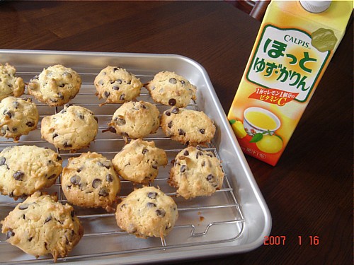 ココナッツとチョコチップのドロップクッキーあやっち(長女:中3)は、1月15日~17日まで、総括テスト(=期末テスト)です。このテストで、3年生の内申が、決まります。ということで、あやっちの好きなこのクッキーを作りました。いつもは、ホワイトチョコチップを入れるのですが、今日は、普通のチョコチップしかなかったので、それを入れました。ホワイトチョコチップを使った方が、ココナッツの味が強く感じられて、私は好きです。ココナッツがあまり好きではない、まなっち(次女:小1)は、今日のクッキーの方が好きなようです。あやっちは、どちらでも、好きなようです。この本のレシピです。↑の【カルピス ほっとゆず・かりん】を、スーパーで見つけました。お湯で薄めるだけで、ホットドリンクの出来上がり~♪味も美味しかったです。21:30ごろ、あやっち(=勉強中)にホットドリンクを出しているのですが、ホットドリンクのバリエーションを増やすために、買いました。