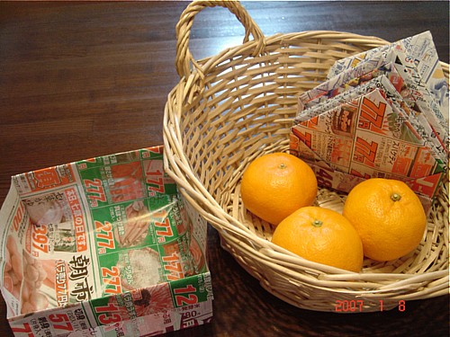 卓上ゴミ入れチラシで折って作る、卓上ゴミ入れです。1月7日に、遊びに来てくれた友人に教えてもらいました。お正月と言えば、みかんに天津甘栗。どちらも、食べる時に、ゴミが出ます。このお正月は、ティッシュの上に、みかんの皮や栗の殻をのせていましたが、すっきりしませんでした。私は、クッキーやおせんべいなども、しけらないという理由から、個包装のものが好きなのですが、それらを食べる時にも使用すると、テーブルが散らかることなく、便利です。