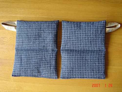 鍋つかみ今まで使用していた、ミトンタイプの鍋つかみが、傷んでいることに、月曜日に気が付きました。今日は、外出する予定がなかったので、ベーグルを作りながら、適当に縫ってみました。外側は、デニム生地。フックに引っ掛ける部分は、ベージュ地に水色の花柄。中には、断熱性を高めるため、フリース生地とキルト芯を入れてあります。半分に折り曲げて使用するので、折り曲げやすいように、真ん中にステッチをしました。今まで使用していたものは、捨てました。