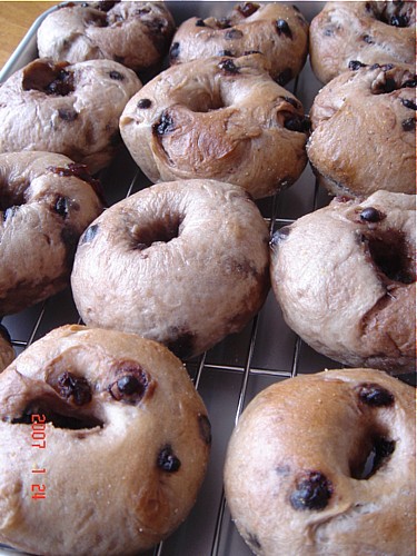 レーズンとチョコチップのベーグル今日は外出する予定がなかったので、ベーグルを焼きました。いつものプレーンベーグル生地に、レーズンとチョコチップを、あるだけ投入。チョコが多すぎたかなぁ。15:10ごろ、まなっち(次女:小1:ベーグル好き♪)が小学校から帰宅するので、おやつに食べたいと思います。