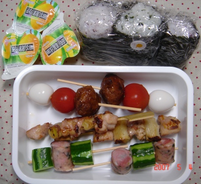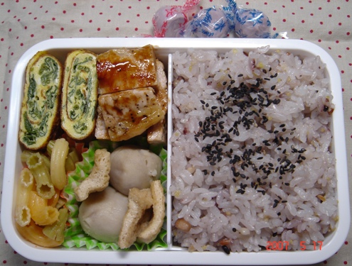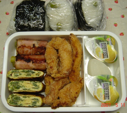 5月11日のお弁当あやっち(長女:高1)のお弁当です。ほぼ同じものを、私も食べています。・グリーンピースの炊き込みごはんのおにぎり・アスパラガスのベーコン巻・ホウレンソウ入り卵焼き・鶏ささみのから揚げ にんにく醤油味・こんにゃくゼリー グレープフルーツ味今日は、高校の「健脚会」という行事で、学校からモリコロパークまで、歩いて行くそうです。去年見た映画、「夜のピクニック」に似た感じの行事です。外でお弁当を食べるので、おにぎりにしました。