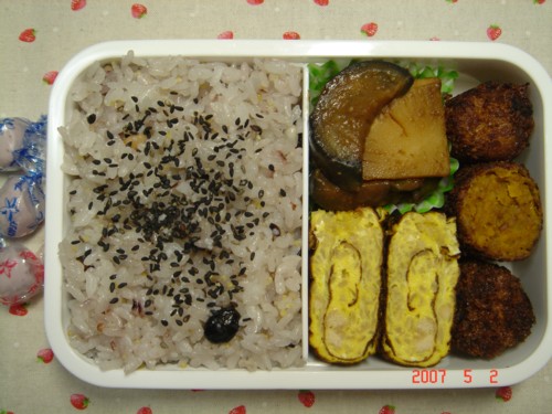 5月2日のお弁当あやっち(長女:高1)の、お弁当です。【おやつ用】 今日は、「いらない。」と言われました。【昼食用】 ・ひとくちヨーグルト ・十六雑穀ごはん+ゴマ塩 ・タケノコとなすとピーマンの味噌炒め ・切干大根の煮物入り卵焼き ・かぼちゃのコロッケ