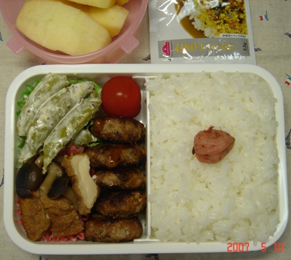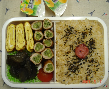 5月7日のお弁当・こんにゃくゼリー マンゴー味・梅こぶ茶入り卵焼き あんまり、おいしくなかったです。・なすの炒め煮・いんげんの豚肉巻き しょうゆ+はちみつで、照り焼き風に味付け。・プチトマト・玄米+ゴマ塩+梅干し