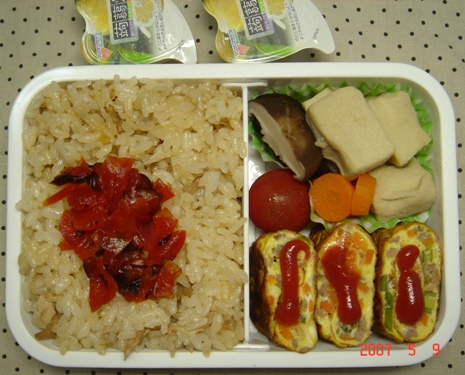 5月9日のお弁当あやっち(長女:高1)のお弁当です。ほぼ同じものを、私も食べています。・こんにゃくゼリー グレープフルーツ味・なめたけとシーチキンの炊き込みごはん+福神漬・高野豆腐の煮物 高野豆腐+人参+しいたけ・ミニトマト・ひき肉入りオムレツ 前日夜のメニューが、 ピーマンの挽肉詰め@まなっち(次女:小2)のリクエストだったので、 同じ材料に、人参とインゲンを足して、炒めておいたものを、 朝、オムレツの具にしました。