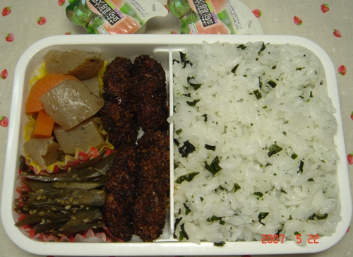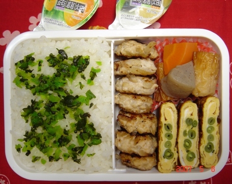 5月8日のお弁当あやっち(長女:高1)のお弁当です。ほぼ同じものを、私も食べています。・こんにゃくゼリー マンゴー味+グレープフルーツ味・寒天入りごはん+しその実 粉末寒天を入れて、白米を炊いています。・鶏のつくね 玉ねぎ入り。 白練りゴマとめんつゆを練り込んでみました。 ちょっと味が薄かったです。・こんにゃく+人参+ちくわの煮物・ゆでたいんげん入り卵焼き朝は、肌寒いくらいだけれど、今日の最高気温の予想は、29度。お弁当が痛みそうなので、今日、保冷バッグを買ってきました。明日から、持たせようと考えています。