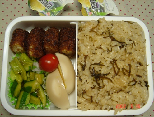 5月15日のお弁当あやっち(長女:高1)のお弁当です。ほぼ同じものを、私も食べています。・こんにゃくゼリーグレープフルーツ味・カニクリームコロッケ(冷凍食品)・きゅうりの中華和え・プチトマト・しょうゆ卵 ゆで卵をしょうゆに漬けたもの。 前日夜に作り、冷蔵庫の中で保存しておいたもの。・塩昆布の炊き込みごはん