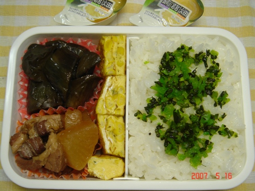 5月16日のお弁当あやっち(長女:高1)のお弁当です。ほぼ同じものを、私も食べています。・こんにゃくゼリーグレープフルーツ味・なすの炒め煮・大根と豚かたまり肉の煮物・コーン入り卵焼き・白米+しその実