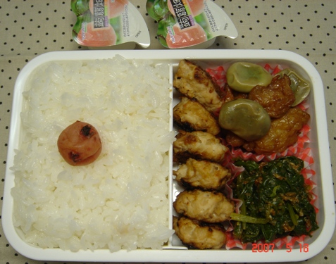 5月18日のお弁当あやっち(長女:高1)のお弁当です。ほぼ同じものを、私も食べています。・こんにゃくゼリー・白桃味・白米+梅干し・鶏肉のつくね・おろしドレッシング味・さつま揚げとソラマメの煮物・ホウレンソウのおひたし