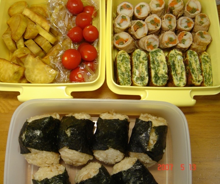 5月13日のお弁当地域の自治会対抗運動会がありました。その時のお弁当です。私+あやっち(長女:高3)+まなっち(次女:小2)の3人分です。・大学芋・プチトマト・いんげん+人参+ちくわの豚肉巻き・ホウレンソウ+白ごま入り卵焼き・なめたけとシーチキンの炊き込みごはんのおにぎり午前中は曇っていて、肌寒い気温でしたが、昼前から日が照りだして、風が出てきました。風はどんどん強くなり、小学校の校庭の砂が舞い上がり、全身砂まみれ。。。帰宅して、すぐにお風呂に入りました。頭・耳・目・鼻から、砂がたっぷり出てきました。。。
