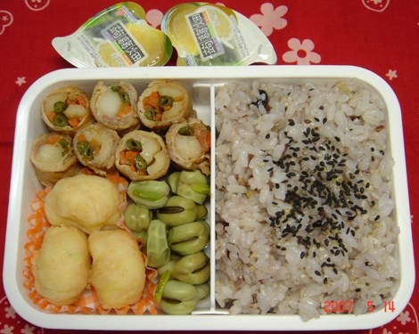 5月14日のお弁当あやっち(長女:高1)のお弁当です。ほぼ同じものを、私も食べています。・こんにゃくゼリー グレープフルーツ味・いんげん+人参+ちくわの豚肉巻き 昨日のお弁当の残りです。・タラモサラダ・そら豆の塩ゆで・十六雑穀ごはん+ゴマ塩
